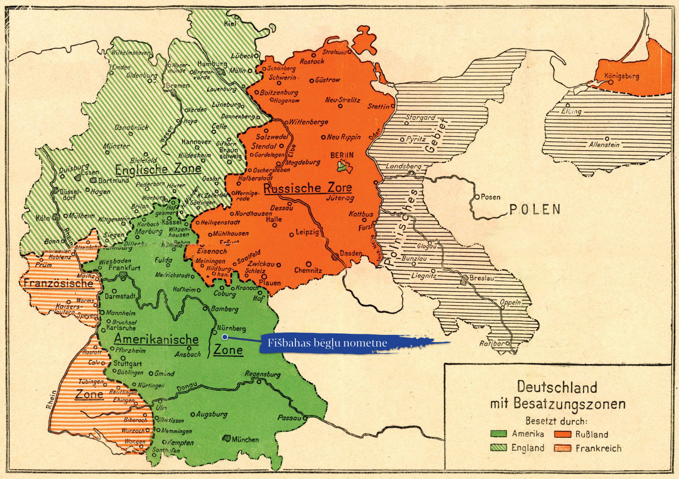 un Padomju Savienība (oranžā). Kartē iezīmēta Fišbahas bēgļu nometnes atrašanās vieta. Mariannas Auliciemas dāvinājums.