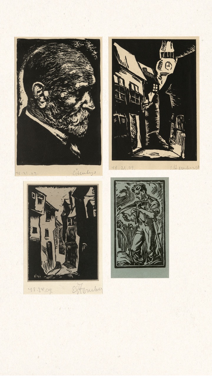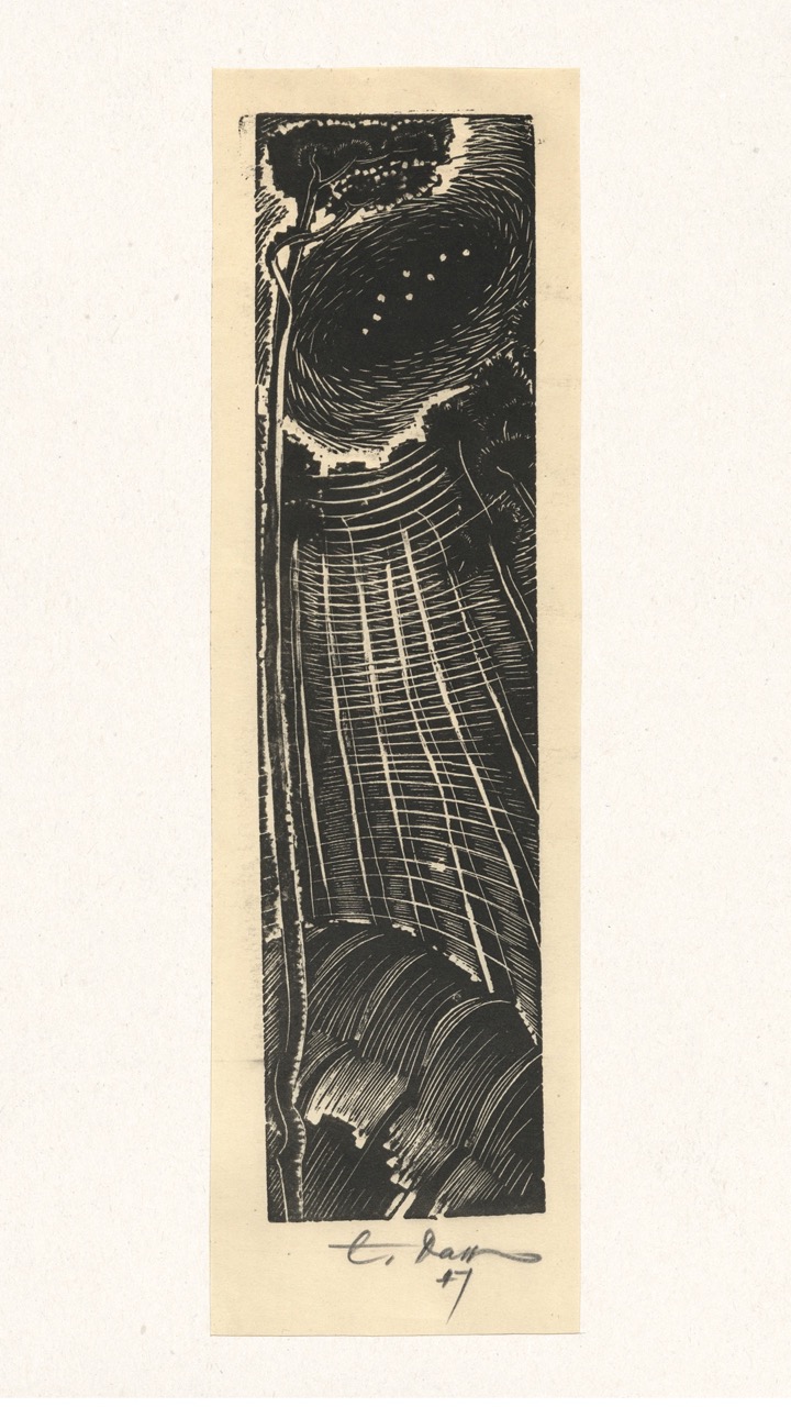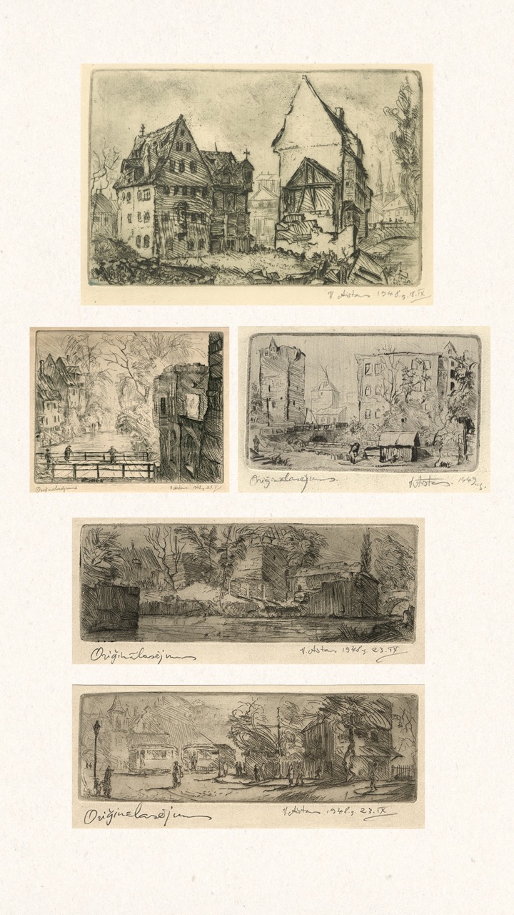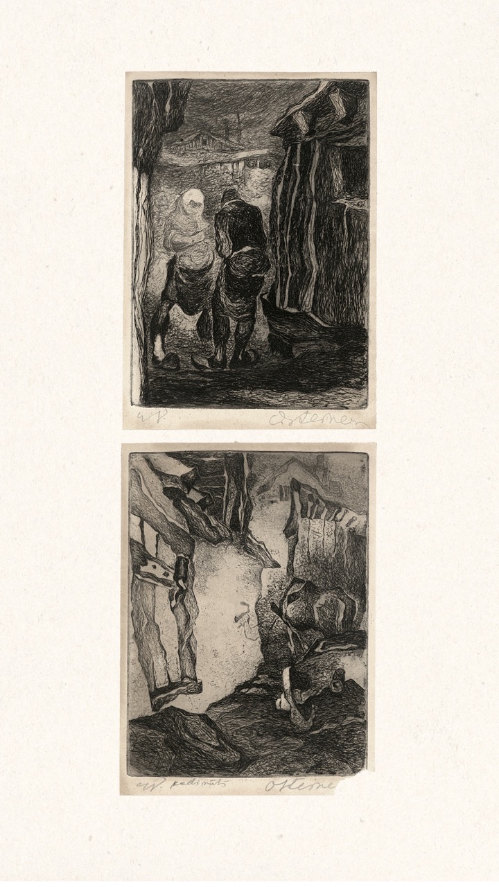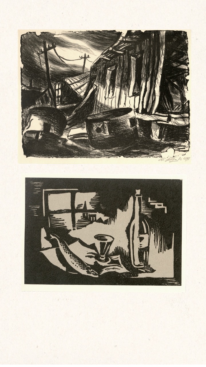 Never published, this folio is now being exhibited for the first time – a “book opening” of sorts, an opportunity for the public to finally see this extraordinary collection of graphic art from a tumultuous time. The folio, along with supplemental material, opens a view into an era of dramatic change in Europe through the eyes of a handful of young Latvian artists in exile. We can only marvel at how – during three years after the end of World War II, in temporary wooden structures of a refugee camp outside of Nürnberg, but under the tutelage of a dedicated teacher – students including Viestarts Aistars, Arturs Damroze, Ojārs Šteiners, and Gastons Ērglis created this lasting diverse and powerful visual message.