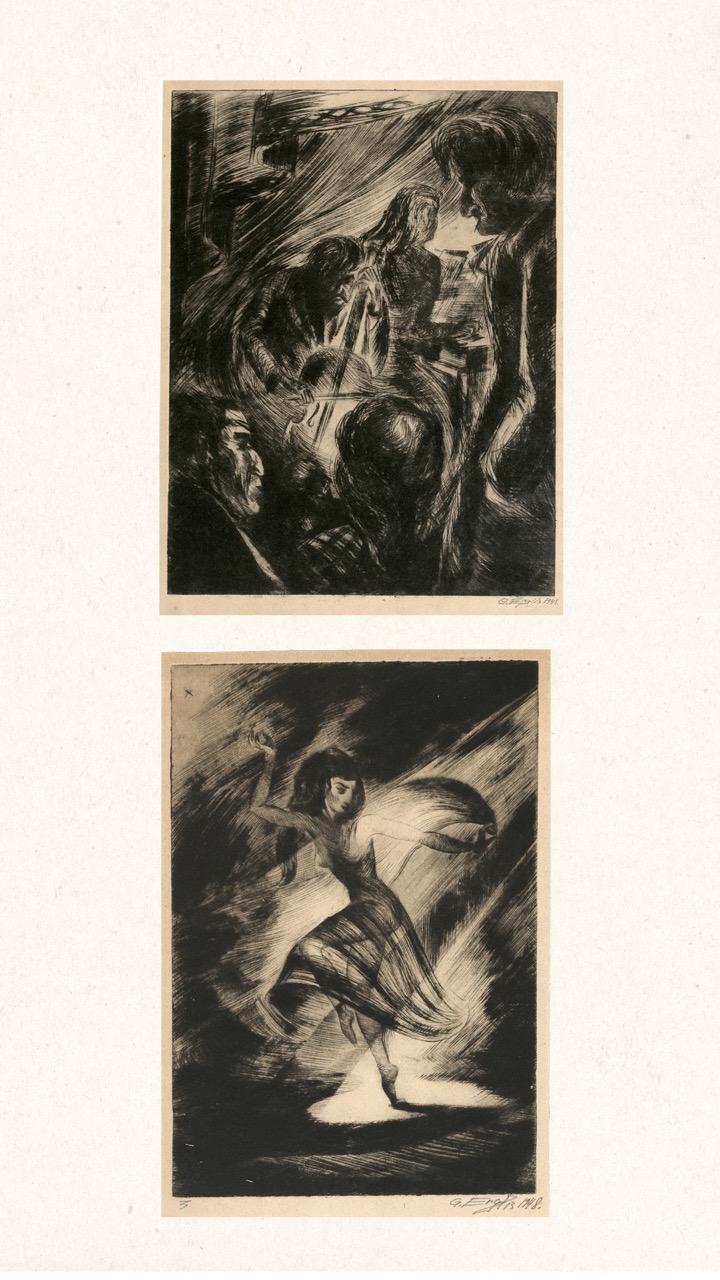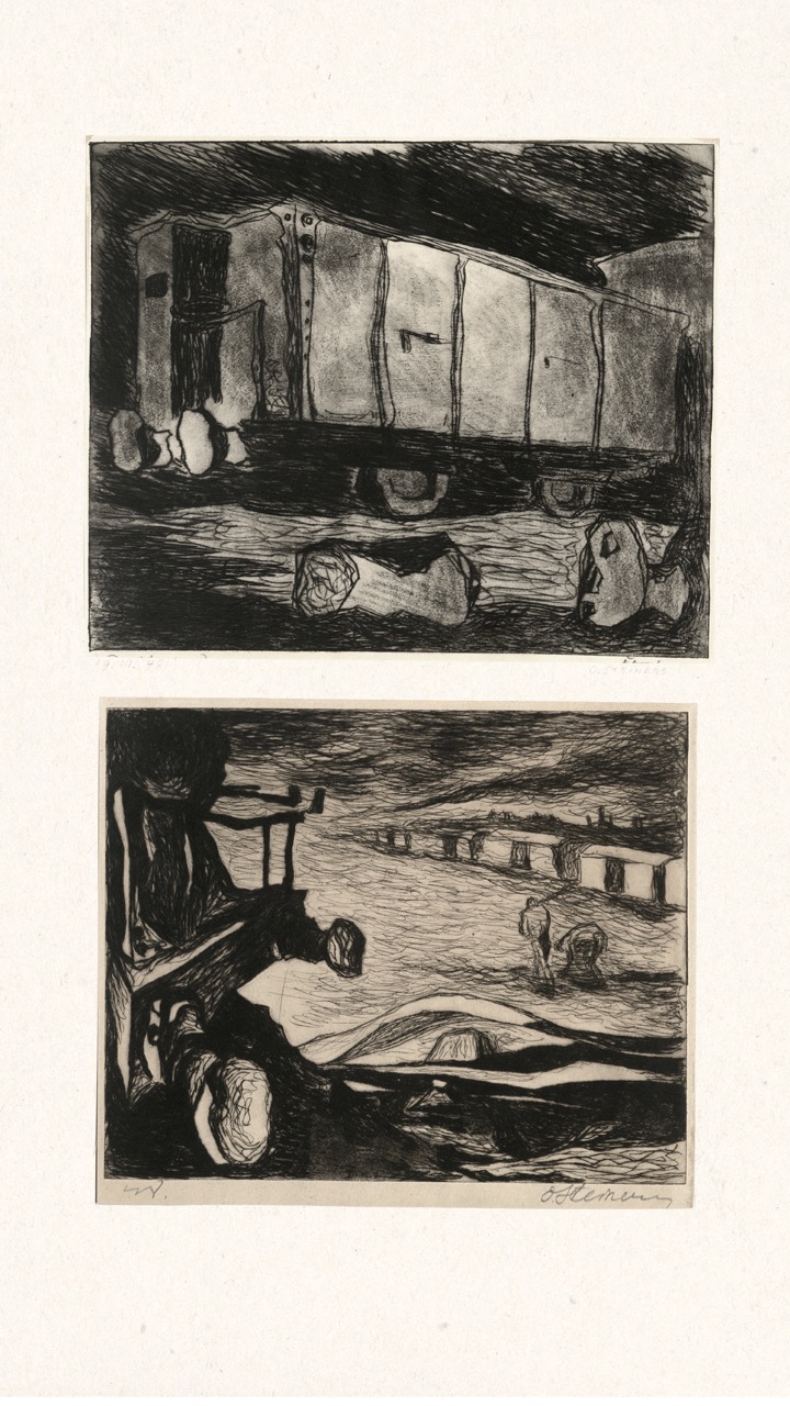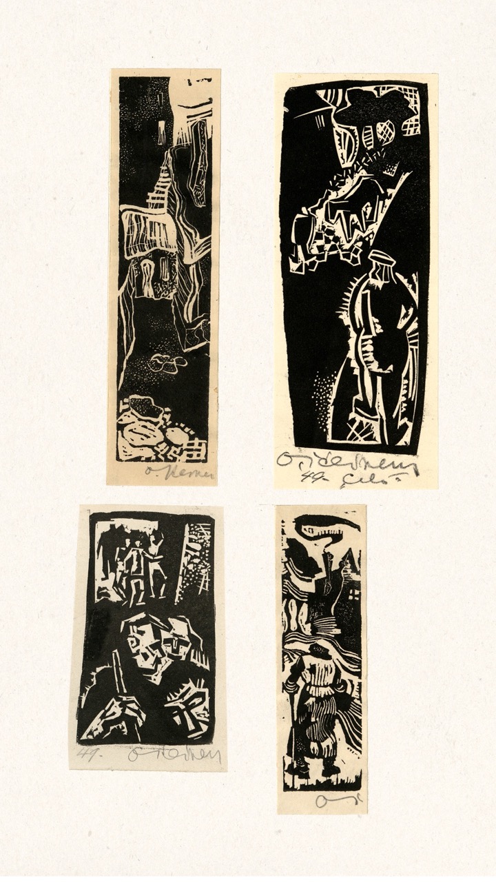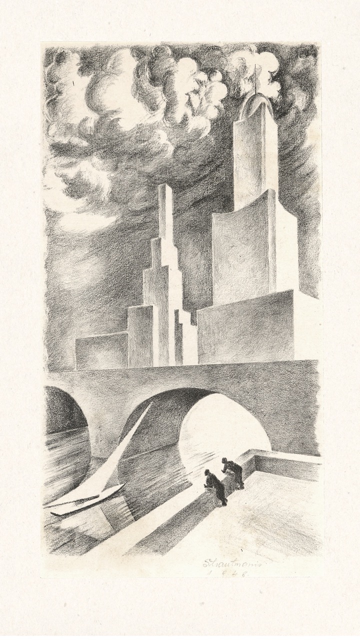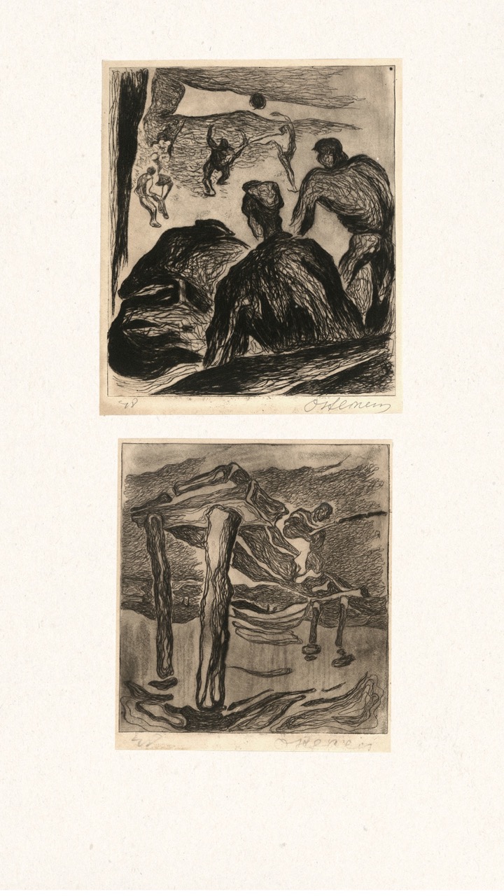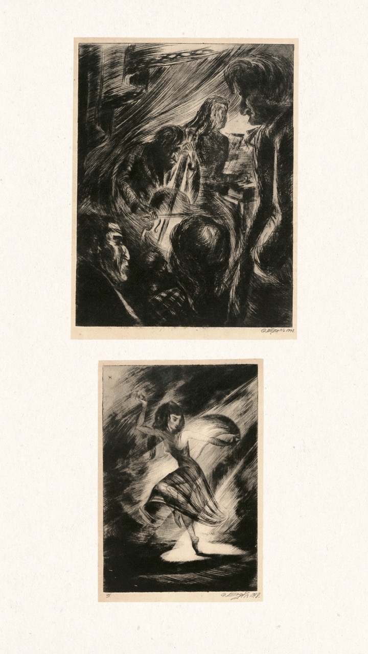 Never published, this folio is now being exhibited for the first time – a “book opening” of sorts, an opportunity for the public to finally see this extraordinary collection of graphic art from a tumultuous time. The folio, along with supplemental material, opens a view into an era of dramatic change in Europe through the eyes of a handful of young Latvian artists in exile. We can only marvel at how – during three years after the end of World War II, in temporary wooden structures of a refugee camp outside of Nürnberg, but under the tutelage of a dedicated teacher – students including Viestarts Aistars, Arturs Damroze, Ojārs Šteiners, and Gastons Ērglis created this lasting diverse and powerful visual message.