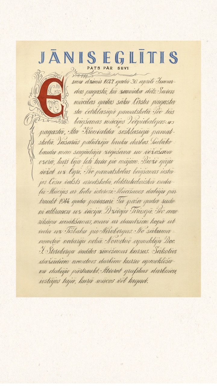Janis Šternbergs, a master printmaker and docent at the Art Academy of Latvia, was tasked with establishing a professional printmaking workshop, to prepare students for work in the graphic design and publishing industries. They started in a very tiny room that could only accommodate a few students, then moved to a larger studio space in 1947. The students worked on their calligraphy and printmaking assignments for four hours every morning. In the afternoons, they worked on community service projects at the camp: they drew charts for the health centre, prepared technical drawings for the radio engineering and driving courses, made street signs, and illustrated school textbooks. They also painted portraits of authors, scientists, and public figures, built stage sets, and organized shows of their own original artwork.